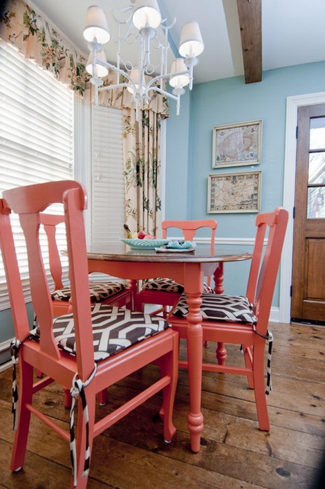 Bộ bàn ghế với màu san hô đậm nổi bật trên nền tường xanh lam. Rèm cửa họa tiết nền màu đào sữa cùng với các họa tiết hoa lá mát mắt mang lại vẻ sự sinh động và rực rỡ cho phòng ăn. Các phối nội thất với màu sắc thông minh này chắc chắn sẽ truyền cảm hứng và niềm vui cho mỗi thành viên của gia đình khi dùng bữa.