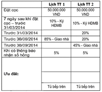 + Nhận nhà ở ngay tháng 9: đặt cọc 50 triệu, sau 7 ngày đặt cọc thanh toán 10%, trước 31/03/2014 thanh toán 20%, trước 30/06/2014 thanh toán 20%, trước 30/09/2014 thanh toán 45%, khi nhận sổ hồng thanh toán 5% còn lại (6 tháng đến 1 năm sẽ nhận sổ hồng).