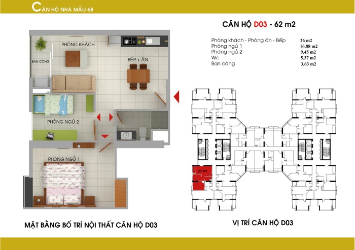 - Diện tích: 51-55-62-63-70m2 ,2 phòng ngủ.