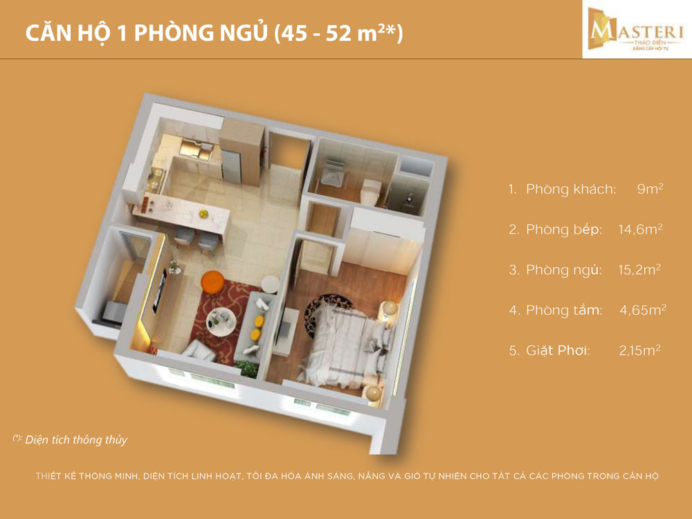 Diện tích: 48 m2(1PN), giá bán từ 1,36- 1.6 tỷ/căn.