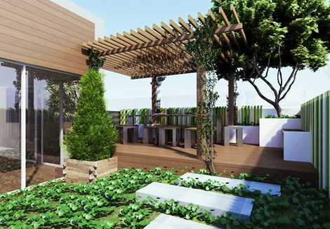 Mảnh vườn treo trên cao gia chủ tận dụng để trồng rau, hoa cỏ và cây xanh lấy bóng mát, tạo mảng xanh cho villa trên không.