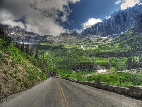 Đường cao tốc trải nhựa gồm 2 làn kéo dài 50 dặm, Going-to-the-Sun-Road khánh thành vào năm 1933, và băng qua hầu hết các địa hình của công viên quốc gia Glacier. Nhờ đó, những ai vượt qua quãng đường này được chiêm ngưỡng những cảnh quan tuyệt đẹp của rừng tuyết tùng, núi non, băng tuyết, hồ nước, lãnh nguyên. Đây là một danh lam thắng cảnh nổi bật ở Montana. Có khoảng 12 dặm đường bám sát vào sườn núi có chỉ định cực kỳ nguy hiểm, và các phương tiện buộc phải giảm tốc độ.
