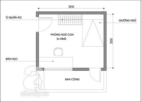 Khu vực cửa sổ ưu tiên cho bàn học và giá sách, vì với trẻ em dưới 12 tuổi, ánh sáng tự nhiên rất cần thiết trong việc phát triển thị lực của mắt. Giường có kích thước 1,2 x 1,9m được bố trí vào góc tường, hướng ngược với cửa ra ban công. Chiếc tủ quần áo kết hợp giá sách được bố trí sau lối ra vào để tránh nhìn trực diện về phía giường.