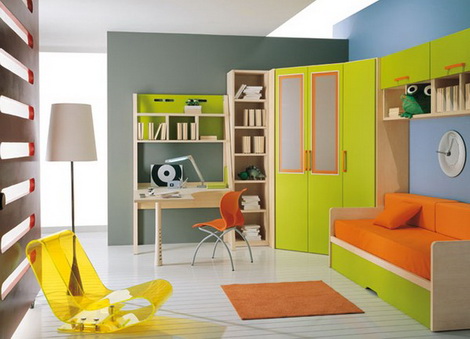 Với phòng trẻ em, mỗi góc phòng cần có những trang trí đặc biệt để phát huy trí tưởng tượng của trẻ. Đó có thể là góc “động vật” hay góc “vũ trụ" tùy theo sở thích của bé. Gam màu sử dụng cho căn phòng là xanh lá, màu của sự phát triển và sáng tạo. Kèm theo đó là những điểm nhấn ngộ nghĩnh bằng những gam màu tương phản như đỏ, da cam vào cánh tủ hay ga trải giường.