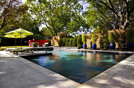 Bây giờ chúng ta sẽ đến với ngoại thất. Có thể nói hai gam màu này rất phù hợp với không gian ngoài trời, đặc biệt là bể bơi, vì chúng có nét tương đồng với cây lá và nước ở hồ. Những chiếc ô màu xanh cốm cùng những chiếc chậu màu xanh côban tạo nên sự thu hút, khiến không gian “loãng” trở nên có điểm nhấn hơn rất nhiều.