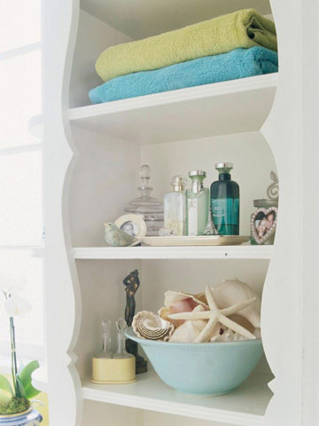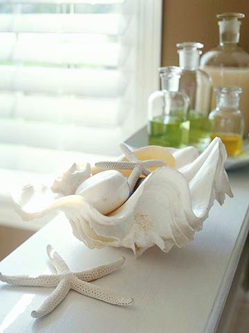 Phòng tắm chính là nơi mà bạn thư giãn gột rửa bụi bặm ngoài đường phố, nơi mà tâm hồn bạn được thả lỏng nhất, hình ảnh những con sao biển, vỏ ốc xuất hiện trong phòng tắm được trang hoàng xanh mát sẽ mang tâm hồn bạn chu du trên những đại dương bao la. Bạn chỉ cần lấy một vỏ ốc biển to, đựng xà phòng và trang trí một con sao biển thật đẹp bên cạnh.