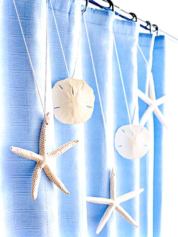 Trên rèm cửa sổ phòng tắm, xâu một chuỗi những “cư dân” của đại dương như sao biển, vỏ sò, vỏ ốc… Rèm cửa xanh biển kết hợp với vỏ sò tạo ra cảm quan trong lành, mát mẻ, ấn tượng thật sảng khoái trong không gian phòng tắm vốn dĩ rất khó trang trí này.