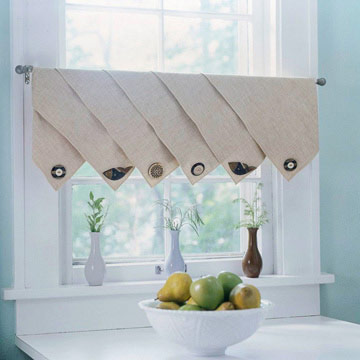 Phong cách bãi biển có thể xuất hiện ở bất cứ căn phòng nào, không gian nào, trong phòng bếp này, bạn có thể sử dụng những lớp cắt của vỏ ốc, vỏ sò để trang trí rèm cửa. Bạn mài những vỏ ốc, vỏ sò theo hình thù khác nhau rồi gắn lên mặt vải bằng keo vải. Rèm cửa nên có màu trung tính sẽ phù hợp với màu của vỏ sò hơn.