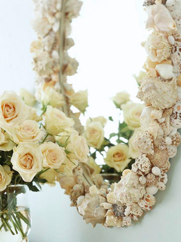 Lấp lánh, mát mẻ, ấm áp, nhẹ nhàng lan tỏa không khí tươi mát của biển xanh trong nhà bằng cách dùng những vỏ ốc nhỏ, phong phú về chủng loại gắn viền xung quanh gương trong phòng ngủ. Bạn sẽ hoàn toàn bị chinh phục bởi không gian đáng yêu này. Thêm một lọ hoa hồng màu kem bên cạnh cùng tông màu tự nhiên cho bạn cảm giác ngày hè thảnh thơi đang tới gần.