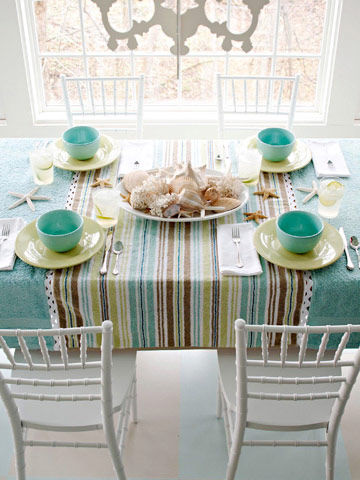 Thay đổi dải khăn trải bàn ở giữa bằng hình ảnh bộ sưu tập vỏ ốc, vỏ sò, sao biển nằm rải rác ở chính giữa bàn cho bạn cảm giác như đang thưởng thức một bữa ăn lãng mạn bên bờ biển dưới ánh sáng dịu nhẹ của hàng ngàn vì sao trên trời và ánh trăng lung linh dát bạc lên mặt biển.