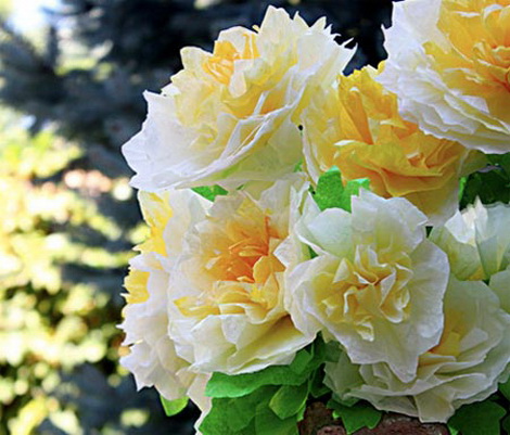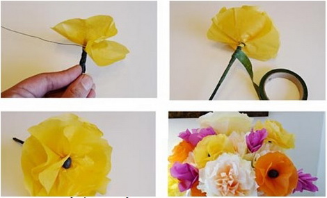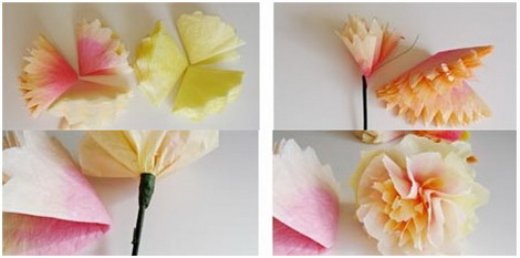 Chuẩn bị: giấy lót bánh màu nước (màu vàng nhạt, màu hồng); giấy làm hoa mỏng màu hồng mười giờ; giấy làm hoa màu vàng nắng; kéo; giấy màu xanh quấn cành.