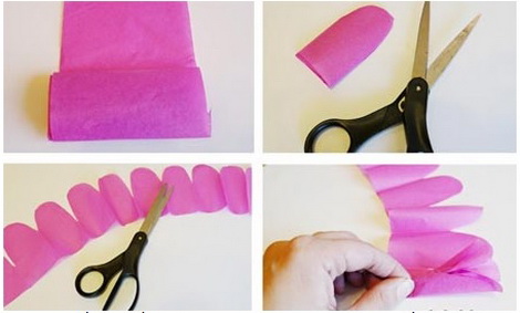 Bạn dùng giấy mỏng làm hoa màu hồng mười giờ: cắt thành những miếng hình chữ nhật nhỏ. Vì giấy mỏng nên bạn có thể xếp các miếng giấy hình chữ nhật chồng lân nhau, cắt các cánh hoa như hình dưới đây.