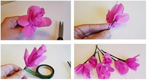 Bạn dùng chỉ hoặc dây kẽm mỏng quấn 3 mảnh giấy đã gấp vào đầu que làm cành hoa. Sau khi quấn xong, bạn dùng tay chỉnh các cánh hoa thành hình bông hoa đẹp tự nhiên. Dùng giấy màu xanh quấn quanh cành.