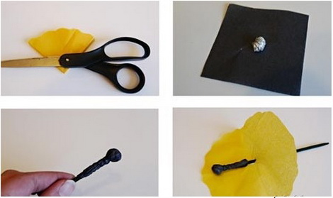 Cách làm nhụy: bạn đặt một miếng bông nhỏ hoặc giấy vụn vào trong mảnh giấy màu đen nâu rồi bọc tròn lại, chừa ra đầu giấy. Đút đầu que làm cành hoa vào trong đầu giấy còn thừa rồi lấy giấy màu xanh quấn quanh tạo cành hoa mang vẻ tự nhiên.