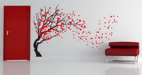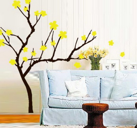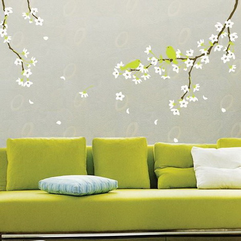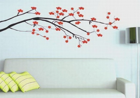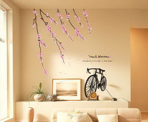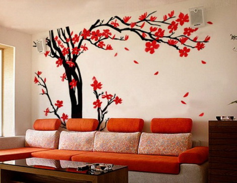 Phòng khách là nơi thường xuyên đón tiếp rất nhiều người, do vậy bạn nên lưu tâm trang trí phòng khách tinh tươm và thu hút. Họa tiết hoa đào màu hồng, đôi khi có thể là màu da cam rất thích hợp cho khoảng tường phía sau sofa.