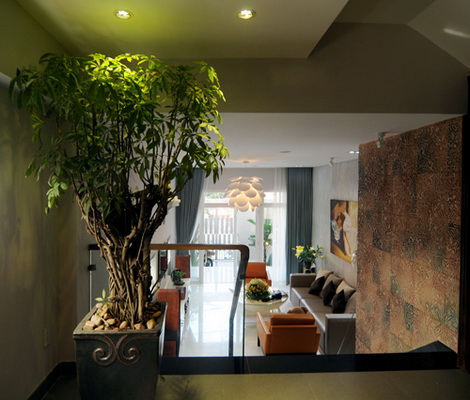 Kiến trúc sư Hà Phục Quốc đưa ra giải pháp nới thêm tầng hầm, thay đổi vị trí cầu thang theo hướng lùi lại và nép sang một bên. Giải pháp này giúp căn nhà tăng thêm nhiều diện tích và mặt bằng không bị chia vụn. Tầng trệt vốn đã có giật cấp vẫn được giữ nguyên để bố trí bếp và bàn ăn tạo ra sự phân chia với phòng khách. Lầu một dành cho chủ nhân, phòng ngủ mở rộng nhìn ra vườn. Để tăng cường ánh sáng, cửa sổ mở theo từng khu vực sinh hoạt riêng nhằm tận dụng bên hông nhà trống.
