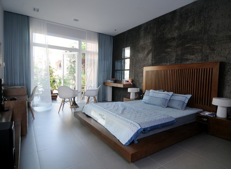 Lầu một dành cho chủ nhân, phòng ngủ mở rộng nhìn ra vườn. Phòng ngủ chính cũng trang trí đơn giản để không gian thoáng, hướng ra sân với thiên nhiên.