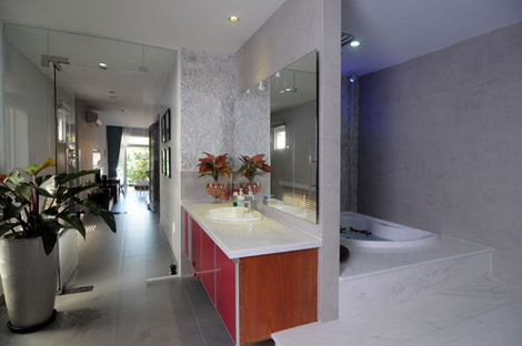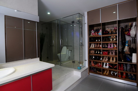 Phía sau cầu thang ở tầng này trước đây có phòng ngủ nhỏ nay được biến thành phòng tắm đầy đủ tiện nghi với bồn tắm nằm, đứng và phòng thay đồ. Cách thiết kế này đi theo xu hướng chủ nhà ngày càng muốn đầu tư cho sự hưởng thụ, tiện nghi. Phòng tắm được thiết kế gọn gàng và kiêm nhiều chức năng...