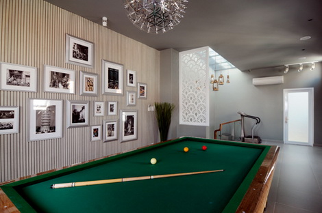 Tầng thượng được bố trí thành phòng giải trí với bàn bida và tập thể dục.