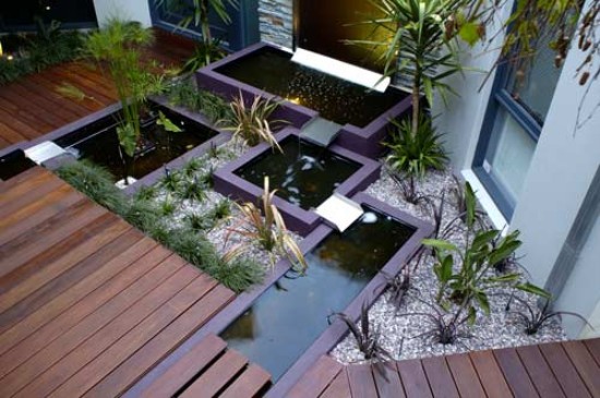 Bạn có thể thiết kế tiểu cảnh là một hồ nước hay con suối nhỏ trong nhà. Hoặc sử dụng các loại cối đá, máng nước, hòn non bộ, bể cá cảnh vừa có tác dụng trang trí vừa tạo tiếng nước chảy róc rách dễ chịu phòng khách, phòng giải trí, phòng ăn… Nếu nhà có chút ít hoặc khoảng trống trên sân thượng thì một bể nước nhỏ thả sen súng, có chỗ ngồi ngắm cảnh kiểu nhiệt đới sẽ là nơi lý tưởng để giải trí thư giãn.