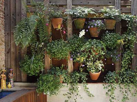 Một cách để mang lại màu xanh cho không gian mở cho môi trường quanh nhà là trồng cây leo trên tường hay còn gọi là vườn tường hay vườn đứng. Cây có thể trồng ở đây có thể là các loại cây bụi, cây rễ, cây leo. Cây này chỉ cần một khoảnh đất nhỏ hoặc có thể trồng trong chậu và để chúng leo theo chiều thẳng đứng. Có thể kết hợp cùng với các cơ cấu giá đỡ hoặc móc khác nhau, các kệ có thể được làm từ tre, nứa, gỗ hoặc kim loại.