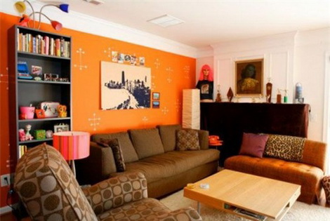 Thông thường, màu da cam ít được dùng làm gam màu chủ đạo cho căn phòng. Nó sẽ phù hợp hơn về cả mặt thẩm mỹ và phong thủy nếu sử dụng cho một mảng tường hay các đồ vật bài trí phòng như chiếc đèn bàn, một bức tranh... Là một màu sắc kích thích sự giao tiếp, mang năng lượng tươi mới đầy sáng tạo nên màu da cam cũng khá thích hợp để trang trí cho phòng khách.