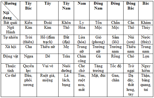 Tám hướng tương ứng với 8 quẻ trong kinh dịch gọi là bát trạch. Theo quan niệm cổ xưa, 8 quẻ này tương ứng với các sự vật, hiện tượng, thuộc tính trong vũ trụ, thiên nhiên, xã hội và các bộ phận trong cơ thể con người như sau: