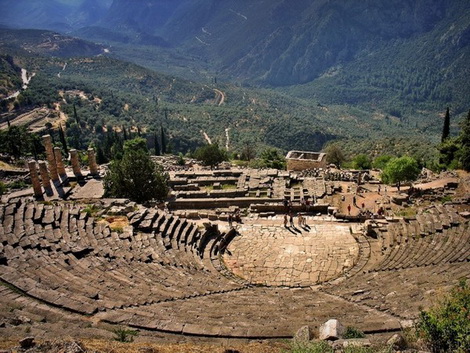 Nhà hát cổ đại Delphi được xây dựng trên một ngọn đồi, giúp khán giả có thể bao quát khu bảo tồn và cảnh quan ngoạn mục xung quanh nó. Nhà hát bắt đầu được xây dựng vào thế kỷ thứ 4 (trước Công nguyên) và có sức chứa 5.000 khán giả. Mặc dù từng được khai quật và phục hồi, nhà hát này hiện đang ở trong tình trạng hư hỏng nặng, hội trường bị tàn phá, các khối đá vôi bị nứt và bong ra từng mảng, nhiều mảng kiến trúc của nhà hát vẫn còn nằm rải rác trong khu vực.