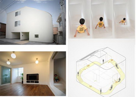 Hẳn các bé nhà bạn sẽ thích ở ngôi nhà này vì chẳng phải leo cầu thang lại còn thường xuyên được trượt cầu nữa chứ! Kiến trúc sư đã thiết kế ngôi nhà 3 tầng, một bên là cầu thang đi lên và một bên là cầu trượt từ tầng 3 xuống tầng 1.