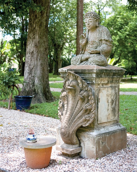 Khuôn viên rợp bóng xanh, yên tĩnh với tiếng chim hót và gió lao xao qua lá, toát lên hình ảnh hiền hoà của một khu vườn nhiệt đới đặc trưng.