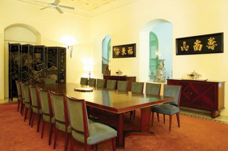 Phòng ăn lớn với sức chứa tối đa cho 16 thực khách là một không gian sáng và ấm cúng nhờ vào những vật liệu ấm của bàn ghế và tủ gỗ, ban ngày căn phòng đầy ánh sáng từ những khung cửa lớn mở ra phía những hành lang thoáng đạt. Khi trào lưu sử dụng máy điều hòa bắt đầu thịnh hành những năm 60s, những song cửa sắt mang phong cách Art Deco mở ra hành lang đã được thay thế bằng những ô cửa kính. Phòng khách lớn với trần cao 6 mét và thoáng mở nên không gian lúc nào cũng thư thái và mát mẻ. Căn phòng này có trần được trang trí bằng motif các hình ô vuông, đây là chi tiết tạo ra nét riêng so với kiến trúc còn lại. Đồ nội thất được chế tác tinh xảo từ các lọai gỗ quý có nguồn gốc từ thời nhà Nguyễn và đã được phục chế một lần vào thời gian những năm 50s. Trong phòng còn có khá nhiều đồ trang trí mang nét dân dã cổ truyền Việt Nam như những đồ trang trí sơn son thếp vàng, những loại đồ sành sứ và các tác phẩm nghệ thuật giá trị như tranh sơn mài của họa sỹ Nguyễn Gia Trí.