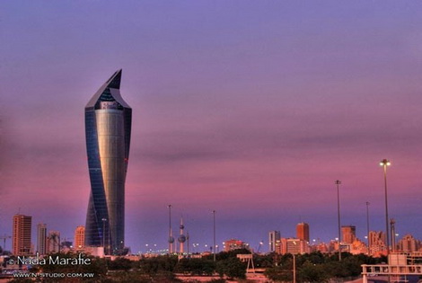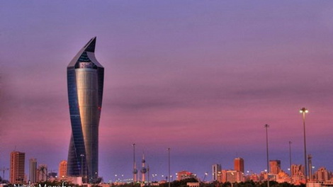 Trung tâm thương mại Kuwait, còn được gọi là tháp Al Tijaria với chiều cao 218 mét nổi bật trên nền trời tím thẫm của xứ sở này.