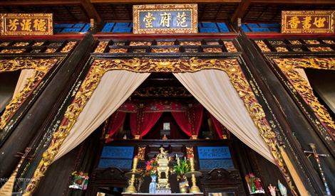 Bao lam và các bức hoành phi được chạm trổ hoa văn công phu và được sơn son thếp vàng bắt mắt.