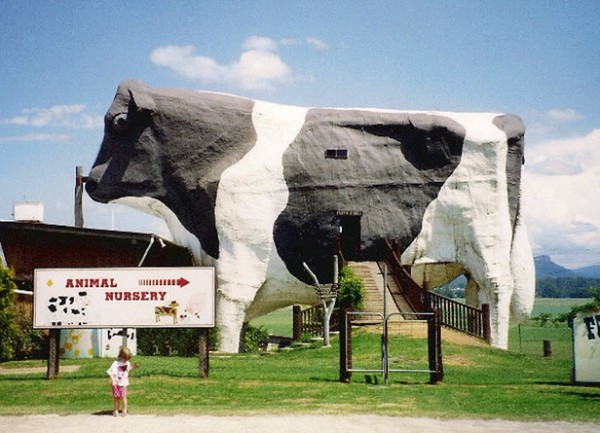 5. Ngôi nhà bò sữa được đặt gần Wauchope, New South Wales, Úc. "Big Bull" được xây dựng bởi kiến trúc sư Peter Russell-Clarke từ 4/7/1987. Chú bò sữa khổng lồ này dài 22 mét và cao 14 mét, nằm giữa trung tâm thú y và một trang trại bò sữa gần Wauchope. Một cửa hàng quà tặng được đặt ở tầng trệt và một phòng trưng bày các sản phẩm tới từ bò nằm phía trên. Bạn còn có thể ngắm quang cảnh của cả vùng trang trại này thông qua cửa sổ phía trên.