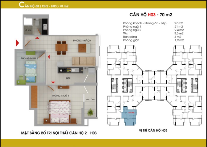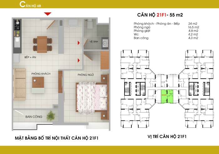 - Diện tích: 51-55-62-63-70m2 ,2 phòng ngủ.
