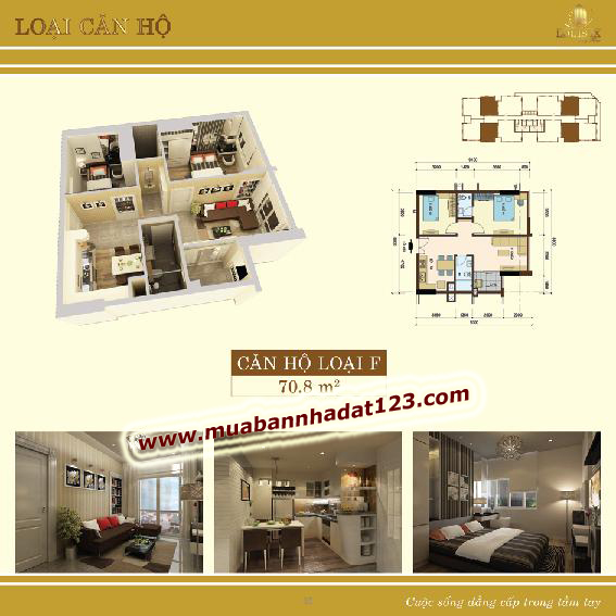 Căn hộ F (11-03) với diện tích 70,8m2, gồm 2 phòng ngủ, 2wc, 1 phòng khách, bếp ăn. Nội thất ngoại nhập, giá bán hiện tại 16.5 triệu/m2.