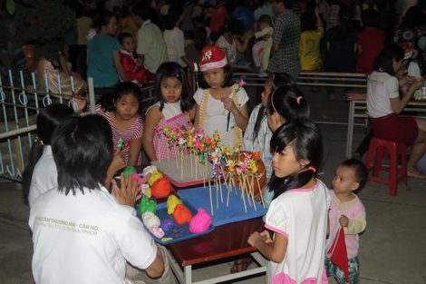 Bên cạnh bong bóng, các nghệ nhân làm tò he, gấp giấy nghệ thuật Origami (Nhật Bản) với những hạc giấy, hoa sen, ngôi sao, thậm chí là ngôi nhà,…để tặng cũng thu hút sự chú ý của đông đảo các em.