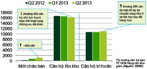 Theo đánh giá của Cty CBRE, thị trường nhà ở BĐS đang ấm dần lên. Ở phân khúc hạng sang, mặc dù giá căn hộ ở TP HCM cao chỉ sau Bangkok nhưng khu vực căn hộ cao cấp lại đã có lượng bán nhiều hơn, tiếp cận được với nhiều tầng lớp trung lưu hơn do lịch thanh toán linh hoạt cùng những ưu đãi khác. Ông Marc Townsend, Giám đốc điều hành CBRE VN cho biết trong quý II/2013, số căn hộ tồn kho tại TP HCM đã giảm so với quý I/2013, mặc dù ước vẫn còn trên 16.000 căn và lượng căn hộ mới chào bán tăng lên trên 400 căn, số căn hộ trì hoãn do một số dự án chuyển sang nhà ở xã hội hay thay đổi hạng mục cũng tăng lên.