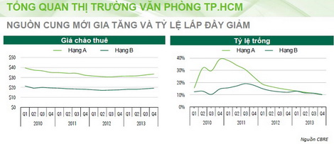 Nguồn cung hạn chế đã giúp giảm được tỷ lệ trống do diện tích thuê tăng, giảm khoảng 20% xuống còn 10% từ 2012 đến nay. CBRE nhận định cả một năm vừa qua thị trường văn phòng cho thuê tại Tp.HCM tương đối ổn định và cú nhúc nhích nhẹ.